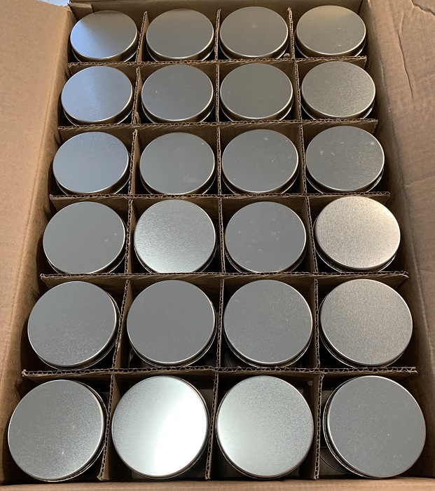 Elegant gold color tin can food graded. suitable for businesses who pack dry foods. 7.5 diameter x9.5Hight, lids included. 24 units in sturdy cardboard box excellent for shipping.